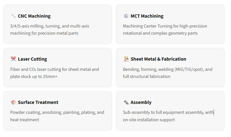 We don't just make parts — we deliver complete manufacturing solutions, from raw material to finished assembly, with full quality control and traceability.