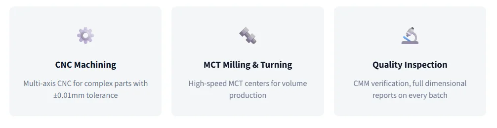Our facility is equipped with multi-axis CNC machining centers and MCT (Machining Center Turning) systems capable of handling complex geometries, tight tolerances, and high-volume production runs. Whether it's precision-bored mounting plates, CNC-milled structural brackets, or custom aluminum profiles — we deliver parts that meet or exceed international standards.