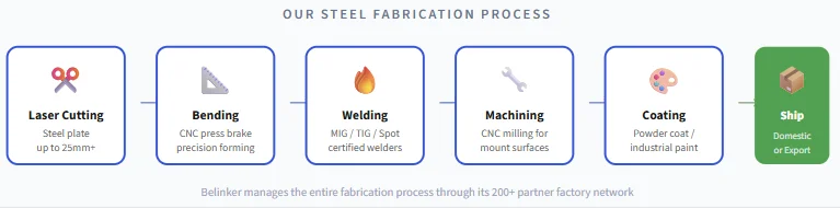 Steel frame structures are the backbone of automation equipment, conveyor systems, machine bases, and industrial production lines. They require a combination of processes that most single factories cannot handle alone: laser cutting thick steel plate, precision bending, multi-pass welding, machining mounting surfaces, and finishing with industrial-grade coatings.
