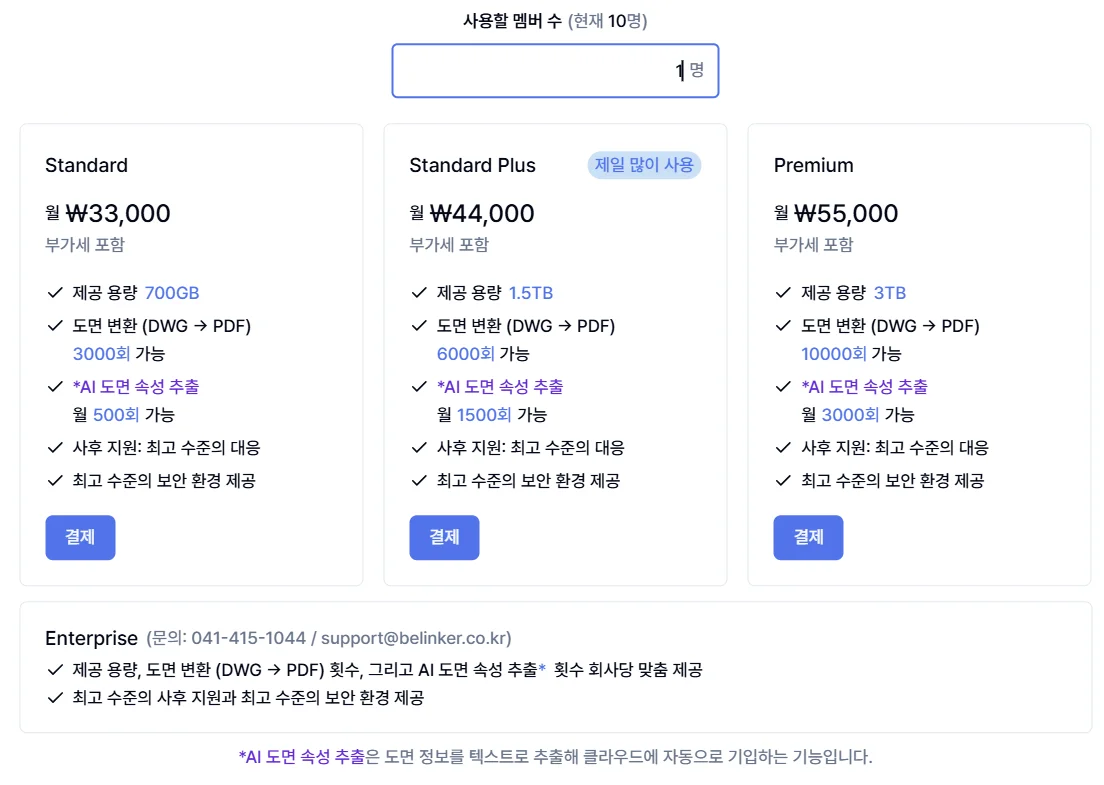 요금제 | 월 요금(부가세 포함) | 제공 용량 | 도면 변환 (DWG → PDF) | AI 도면 속성 추출 | 특징 |