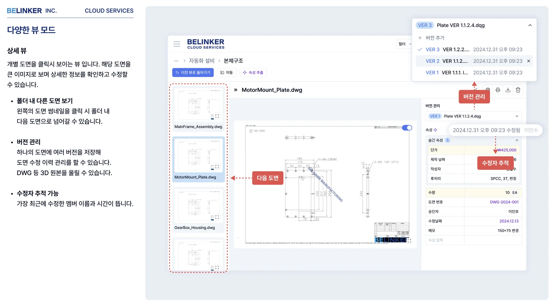 DWG 파일, 도면 이력, 버전 관리, 수정자 추적까지 하나의 클라우드에서 체계적으로 관리할 수 있는 제조업 전용 도면관리 솔루션, 바로 비링커 클라우드(BELINKER CLOUD)를 소개합니다.