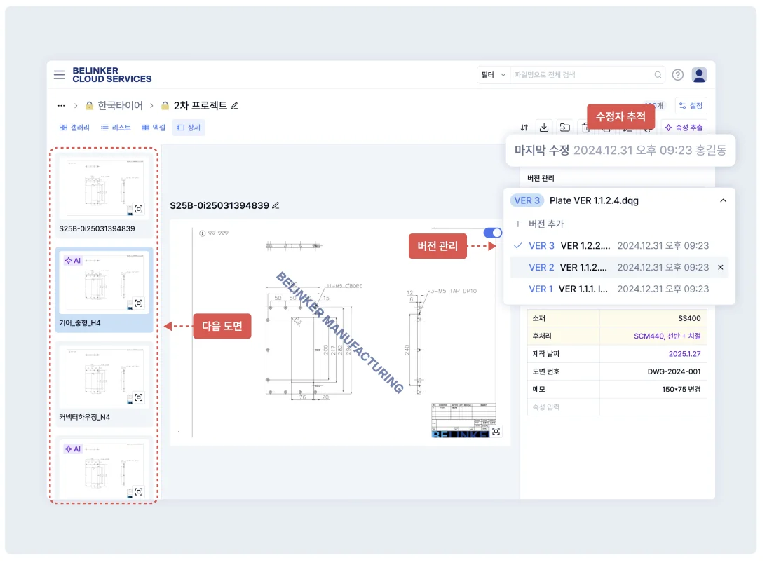 사용자는 특정 도면을 선택한 후, 관련된 성적서와 조립도를 몇 번의 클릭 또는 간단한 드래그 앤 드롭으로 추가할 수 있습니다. 이 과정에서 비링커 클라우드는 사용자가 파일을 쉽게 추가하고 관리할 수 있도록 다음과 같은 직관적인 인터페이스와 기능을 제공합니다.
