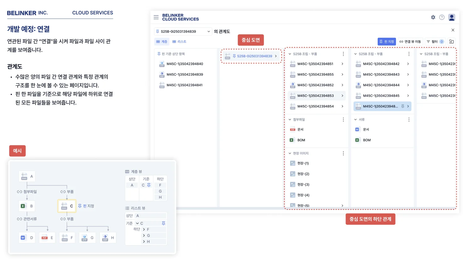 이처럼 비링커 클라우드의 연결 기능은 프로젝트에 필요한 모든 문서를 체계적으로 관리하며, 필요한 정보를 빠르게 찾아 업무 생산성을 극대화합니다. 나아가 도면, 성적서, 조립도뿐만 아니라 다양한 파일 형식을 지원하여 여러 종류의 파일들을 한 곳에서 통합 관리할 수 있는 진정한 의미의 중앙 집중형 정보 허브를 구축합니다. 이는 복잡한 파일 형식과 시스템의 혼재로 인한 비효율을 해결하는 강력한 기반이 됩니다.