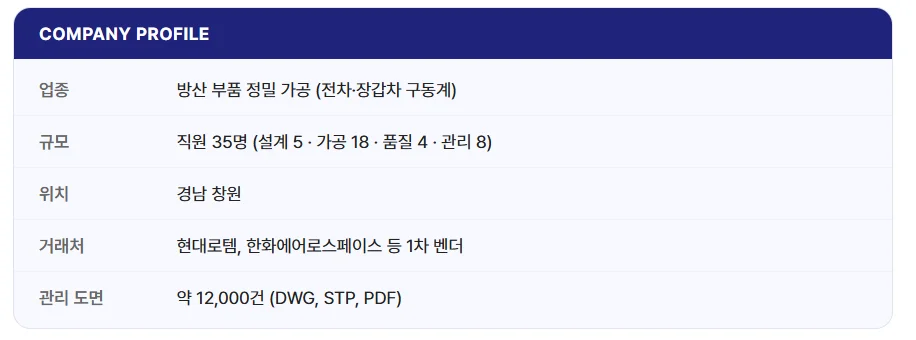 방산 부품의 특성상, 도면 하나가 유출되면 국가 안보에 직접적인 위협이 됩니다. 그래서 A사 경영진은 도면 보안 시스템 구축을 오랫동안 고민해 왔지만, 기존 PDM/PLM의 높은 비용이 발목을 잡았습니다.