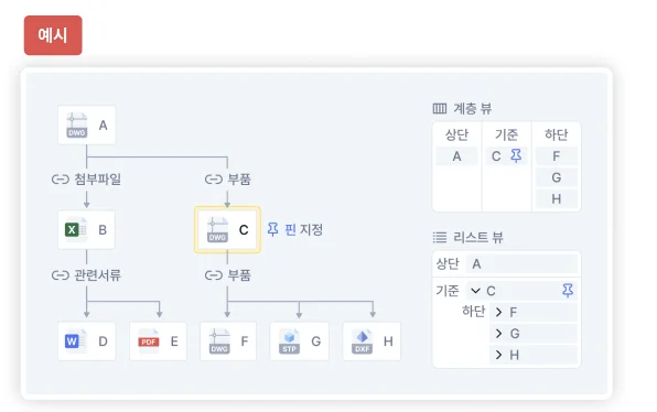 관계도가 보여주는 계층 구조로 첨부파일 및 부품이 도면에 어떻게 연관되는지 직관적으로 파악합니다.