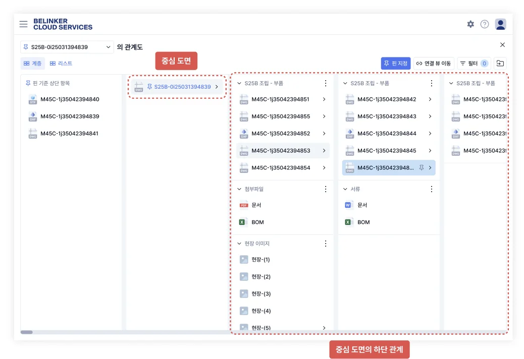 비링커 클라우드의 연결 기능은 국내 도면관리 솔루션 중 최초로 도입한 기능으로서, 한 개의 도면에 첨부파일과 도면 등을 연계해서 편리하게 볼 수 있는 기능입니다.
