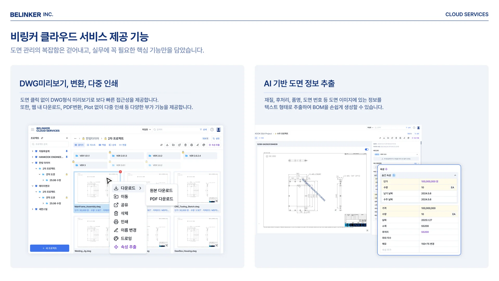 중소 제조기업도 부담 없이 시작할 수 있는 클라우드 도면관리 솔루션. 도면 검색·버전 관리·AI 속성 추출·권한 통제까지, 비링커 클라우드 한 곳에서 해결할 수 있습니다.