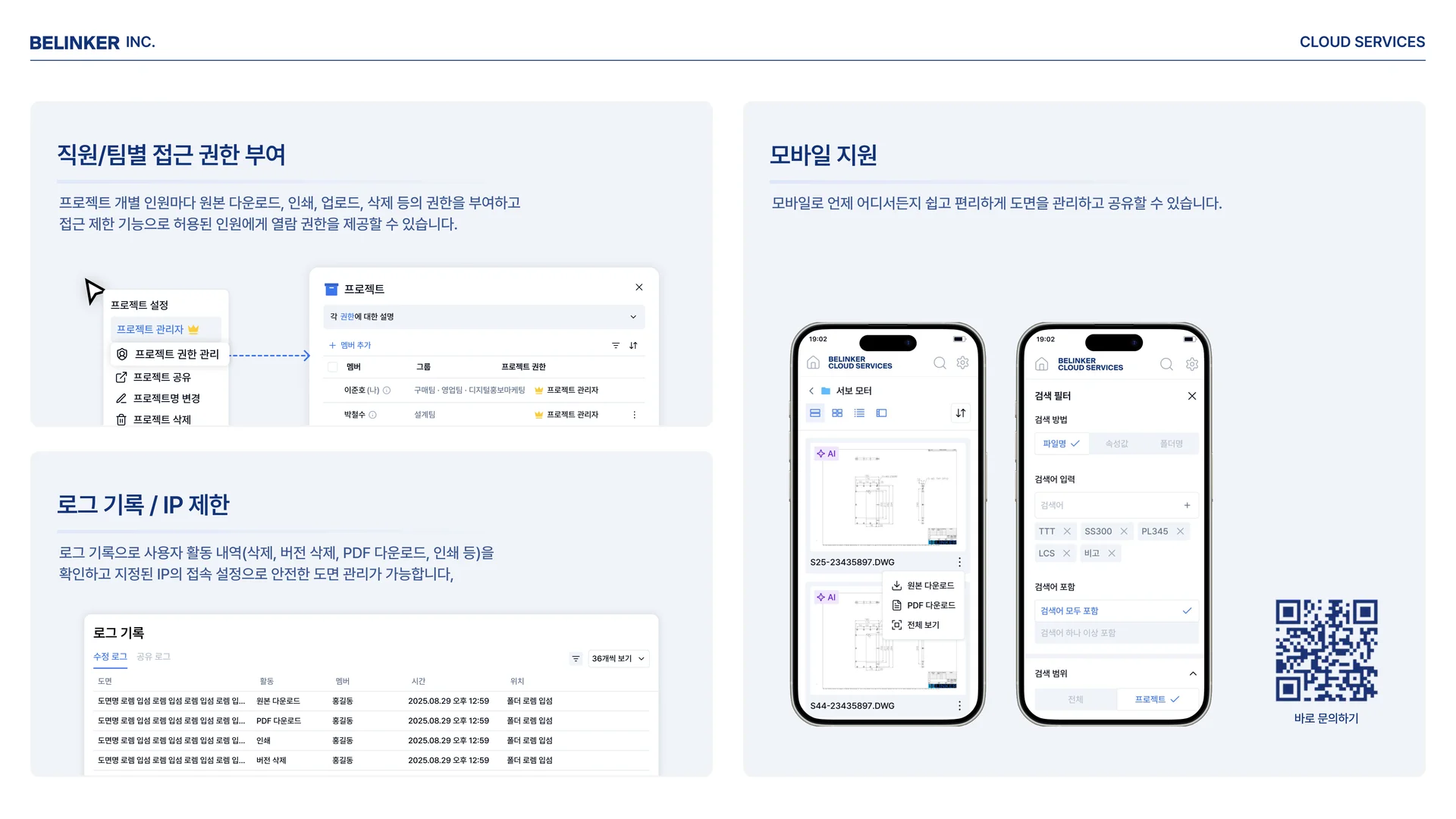 도면은 회사의 핵심 IP입니다. 비링커 클라우드는 멤버별·팀별로 원본 다운로드·인쇄·업로드·삭제 권한을 세분화해 부여하고, 폴더 단위 접근 제한, 활동 로그 기록, IP 기반 접속 제한까지 제공합니다. 모바일에서도 동일한 권한 체계로 작동하므로, 외근 중 현장 작업자도 안전하게 도면을 열 수 있습니다.