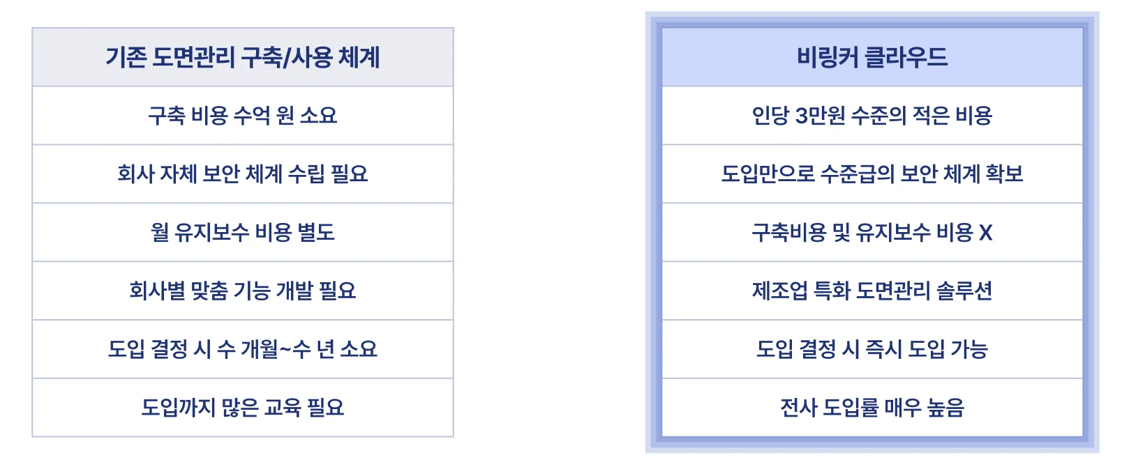 비링커 클라우드는 기존 도면관리 구축 시스템 대비 매우 효율적인 비용과 시스템을 제공하고 있습니다.