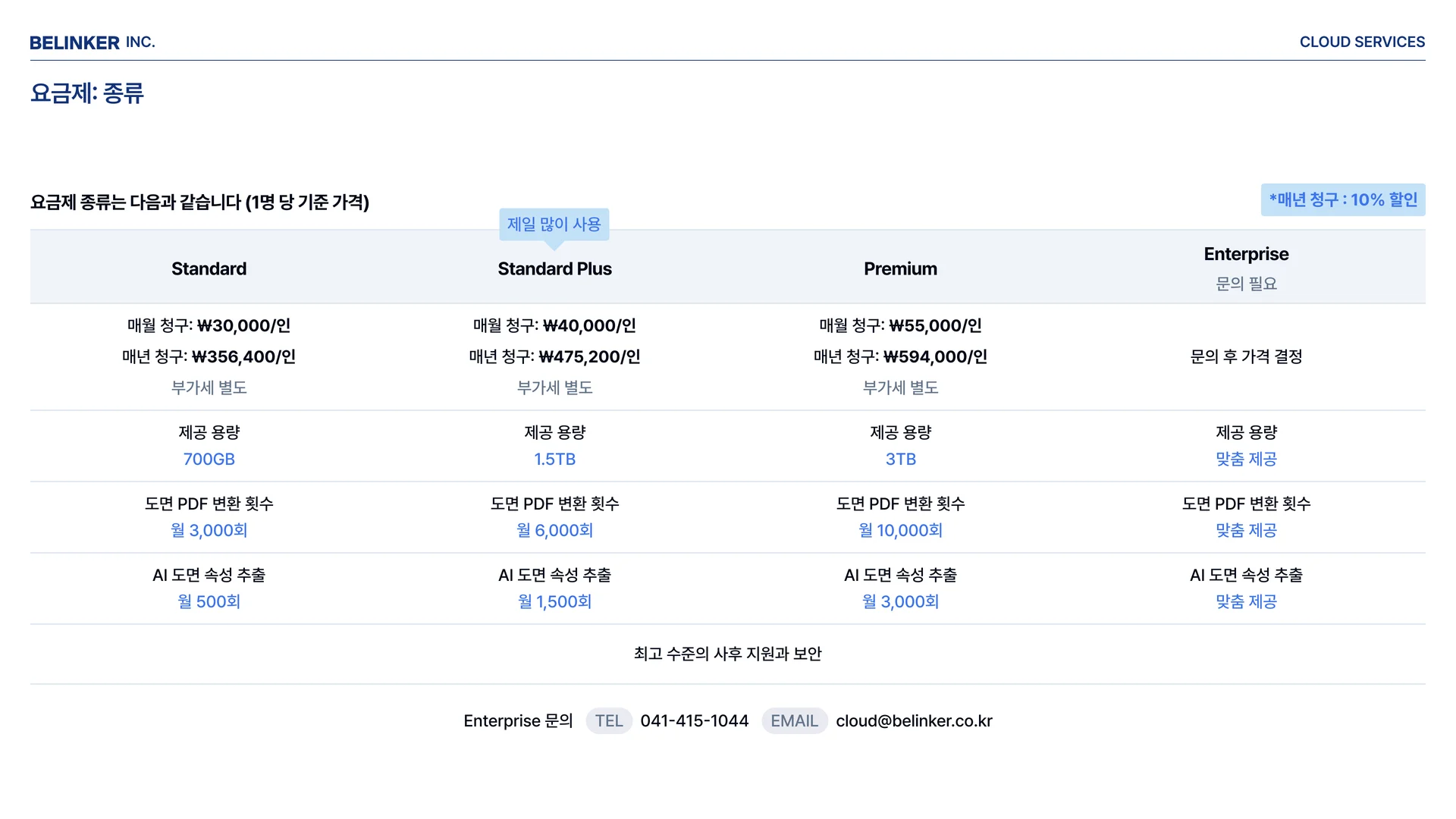 비링커 클라우드는 제조업 도면관리에 특화된 클라우드 SaaS 서비스입니다. "문의 바랍니다" 없이, 요금표를 공개합니다.