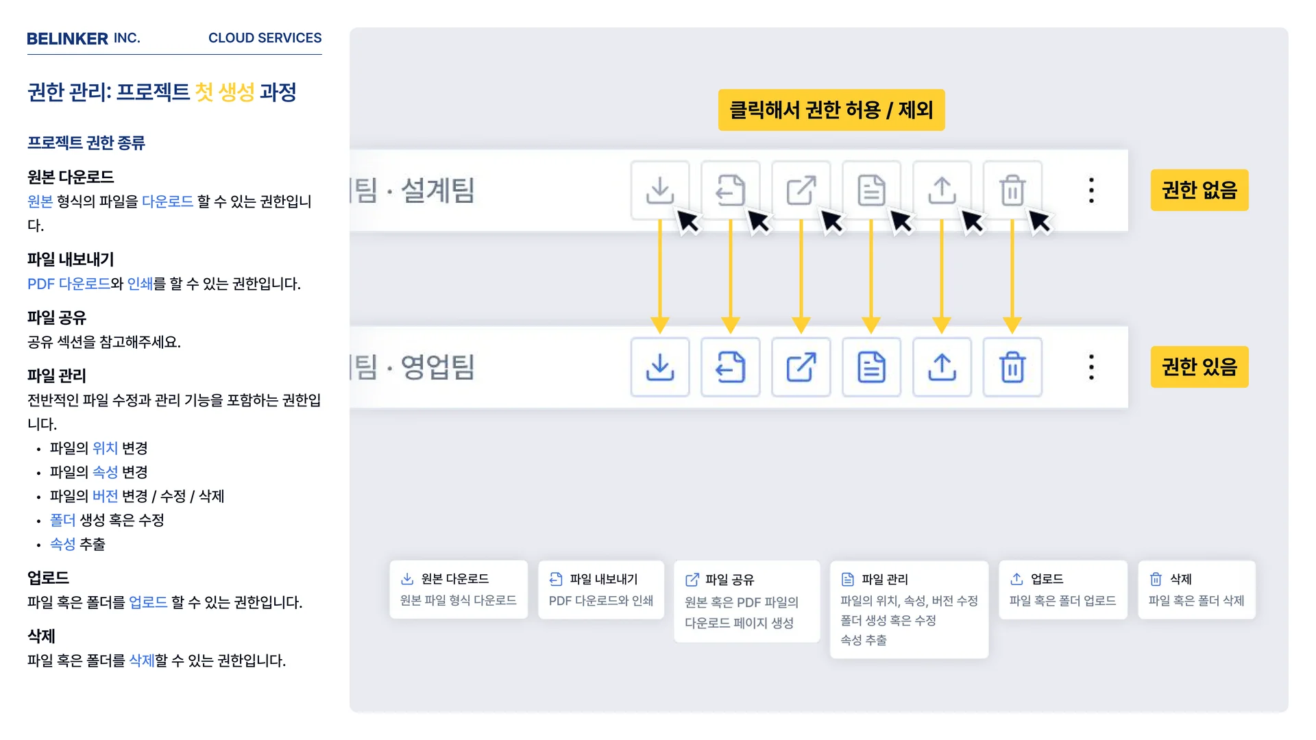 프로젝트 단위와 폴더 단위의 이중 권한 체계를 제공합니다. 원본 다운로드, 파일 내보내기, 공유, 파일 관리, 업로드, 삭제까지 6가지 권한을 멤버별로 세밀하게 제어할 수 있습니다. 그룹 기능으로 부서별 일괄 권한 적용도 가능합니다.