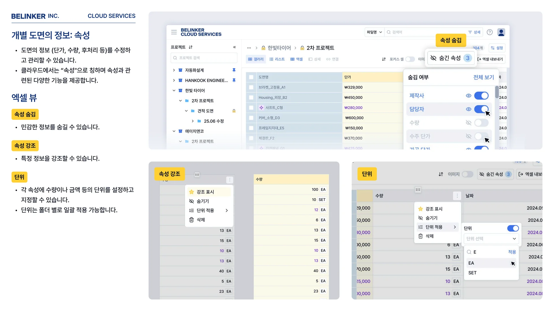 도면에 단가, 수량, 재질 등 속성 정보를 직접 연결하고, 엑셀 형태의 뷰에서 한 화면으로 확인·수정할 수 있습니다. 속성 숨김, 강조, 단위 설정 기능도 제공되며, 엑셀 파일로 내보내기도 가능합니다.