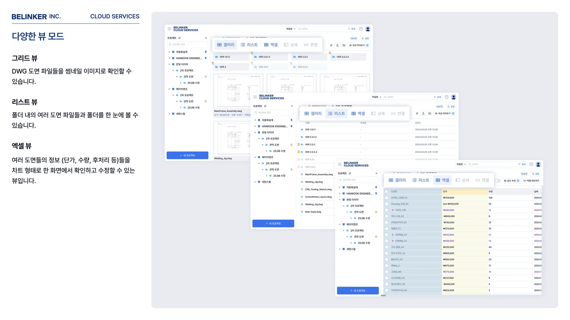 그리드 뷰(썸네일), 리스트 뷰(파일+폴더 목록), 엑셀 뷰(속성 차트), 상세 뷰(개별 도면 확대) 등 업무 상황에 맞는 다양한 뷰를 지원합니다.
