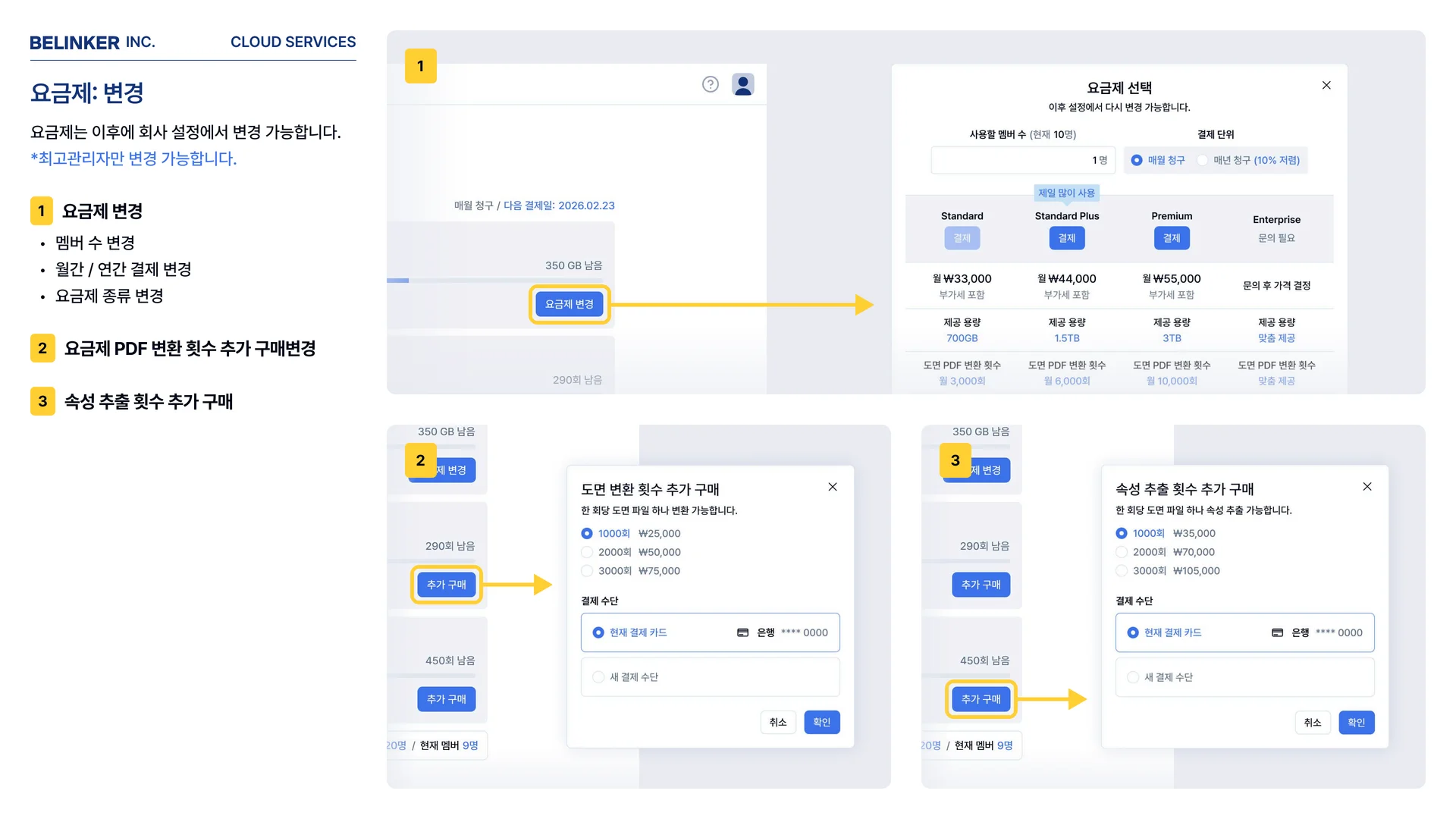 네, 회사 설정에서 언제든 요금제 종류, 멤버 수, 결제 주기(월간/연간)를 변경할 수 있습니다. PDF 변환 횟수나 AI 속성 추출 횟수도 추가 구매가 가능합니다.
