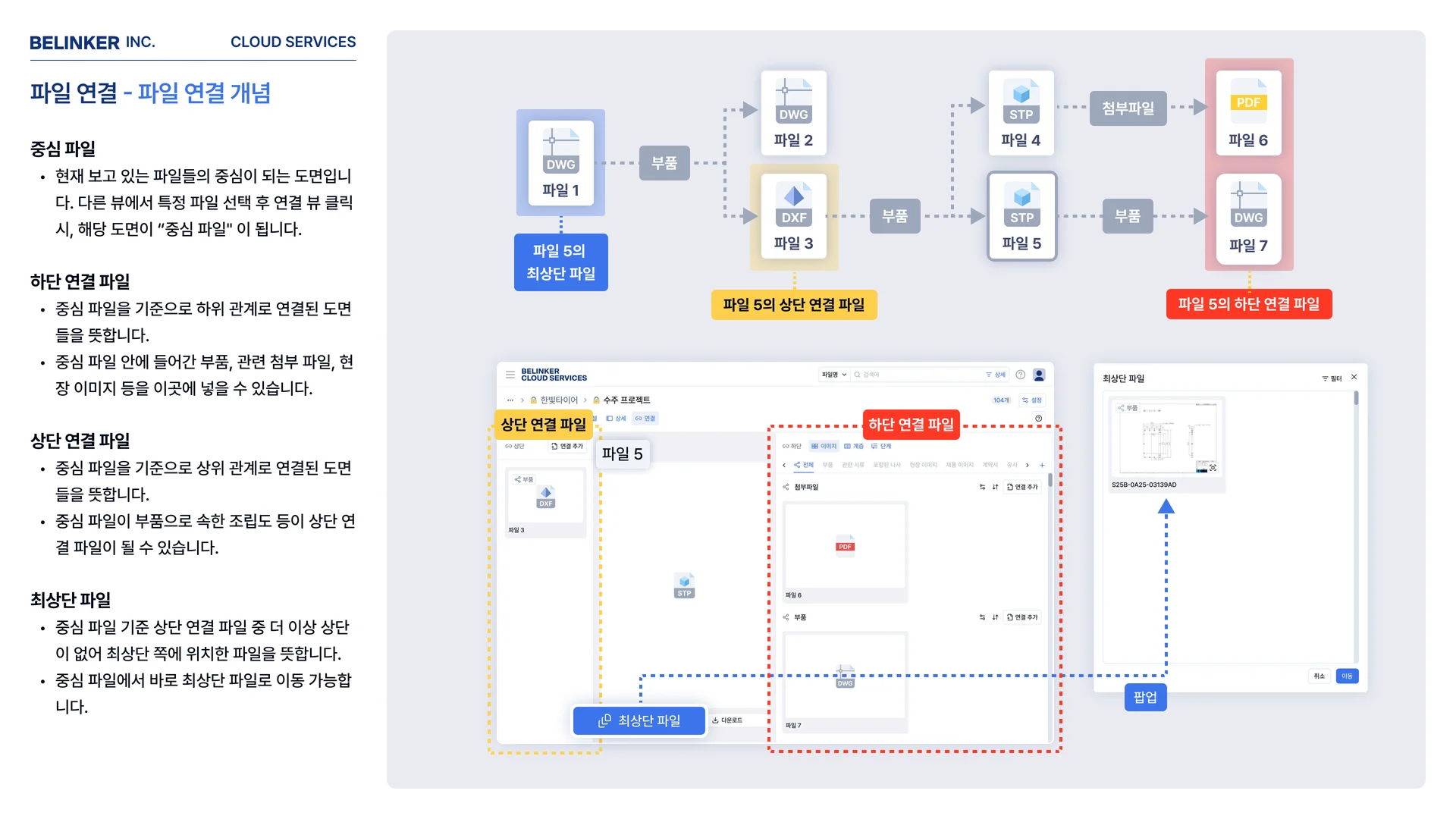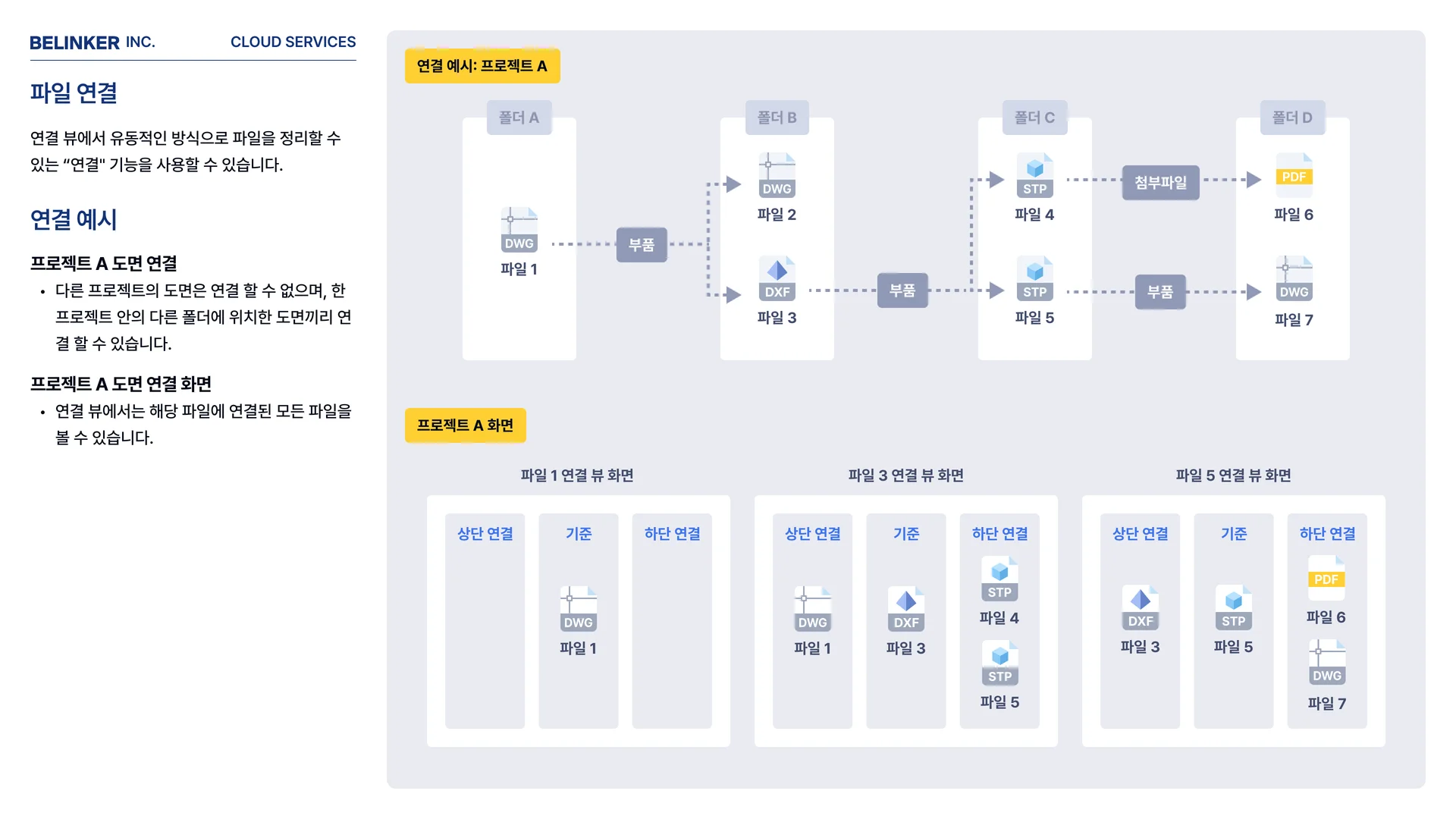 비링커 클라우드의 파일 연결 기능은 도면, CAM 프로그램, 검사성적서, 가공 이력서 등 하나의 부품에 관련된 모든 파일을 계층 관계로 연결합니다.