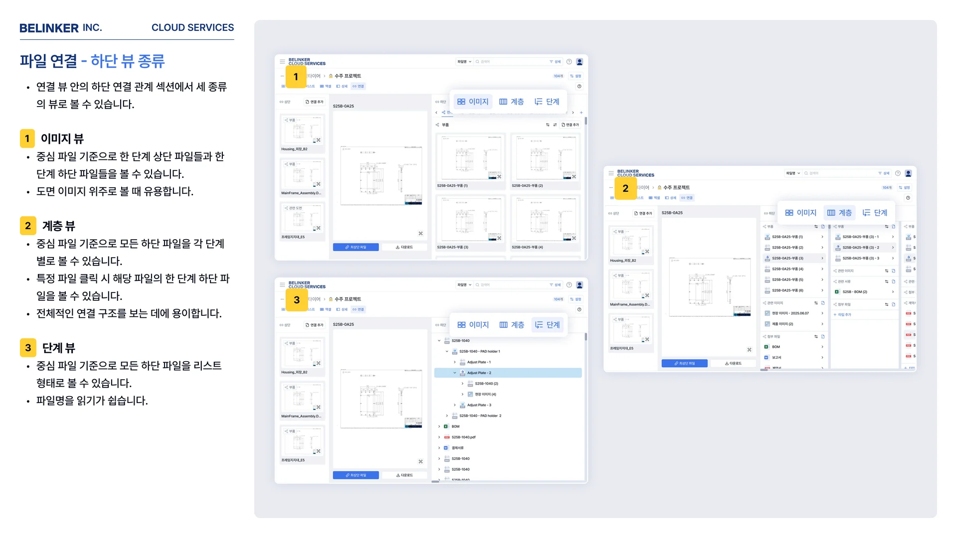 하위 연결 파일은 이미지 뷰, 계층 뷰, 리스트 뷰 세 가지로 볼 수 있습니다. 전체 구조를 파악할 때는 계층 뷰가, 파일명을 빠르게 훑을 때는 리스트 뷰가 편리합니다.