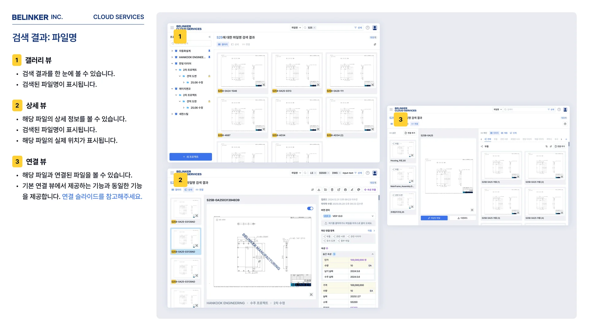 도면을 찾았는데, 관련 문서를 또 찾아야 하는 문제. 비링커 클라우드의 파일 연결 기능은 조립도, 부품도, 검사성적서, 가공 이력서 등을 계층 관계로 연결합니다.