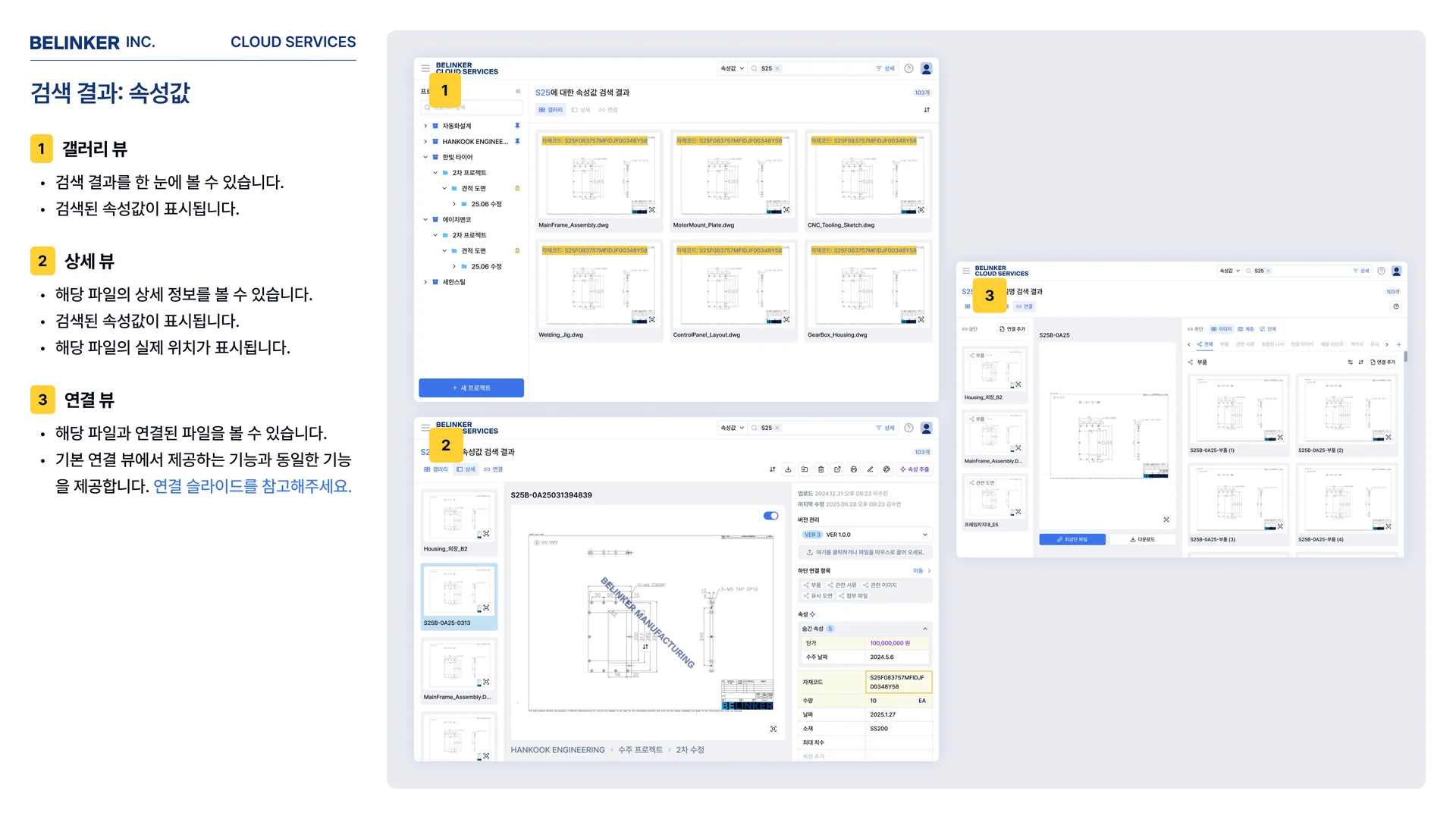 비링커 클라우드의 통합 검색은 파일명뿐 아니라, 도면에 입력된 속성값(단가, 재질, 품번 등)과 폴더명까지 한 번에 검색합니다.