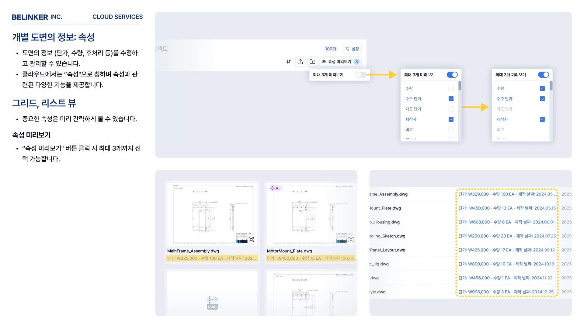 도면을 하나하나 열어서 단가와 재질을 확인하는 건 과거의 방식입니다. 속성 미리보기를 설정하면, 그리드 뷰에서 도면 썸네일 옆에 단가, 수량, 재질 등 핵심 속성이 바로 표시됩니다.