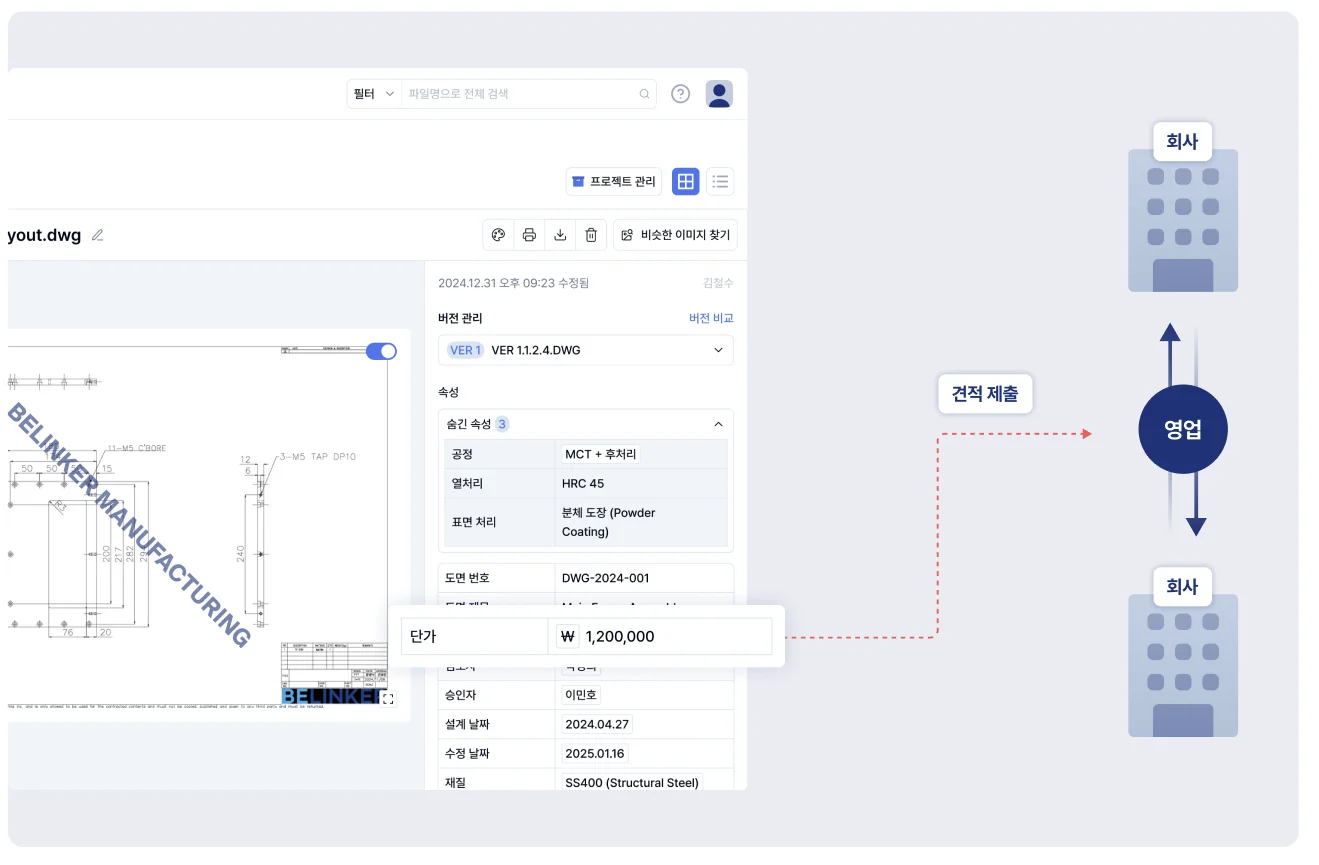 도면 검색만으로 과거 견적과 조건을 즉시 확인해 빠르게 대응할 수 있습니다.