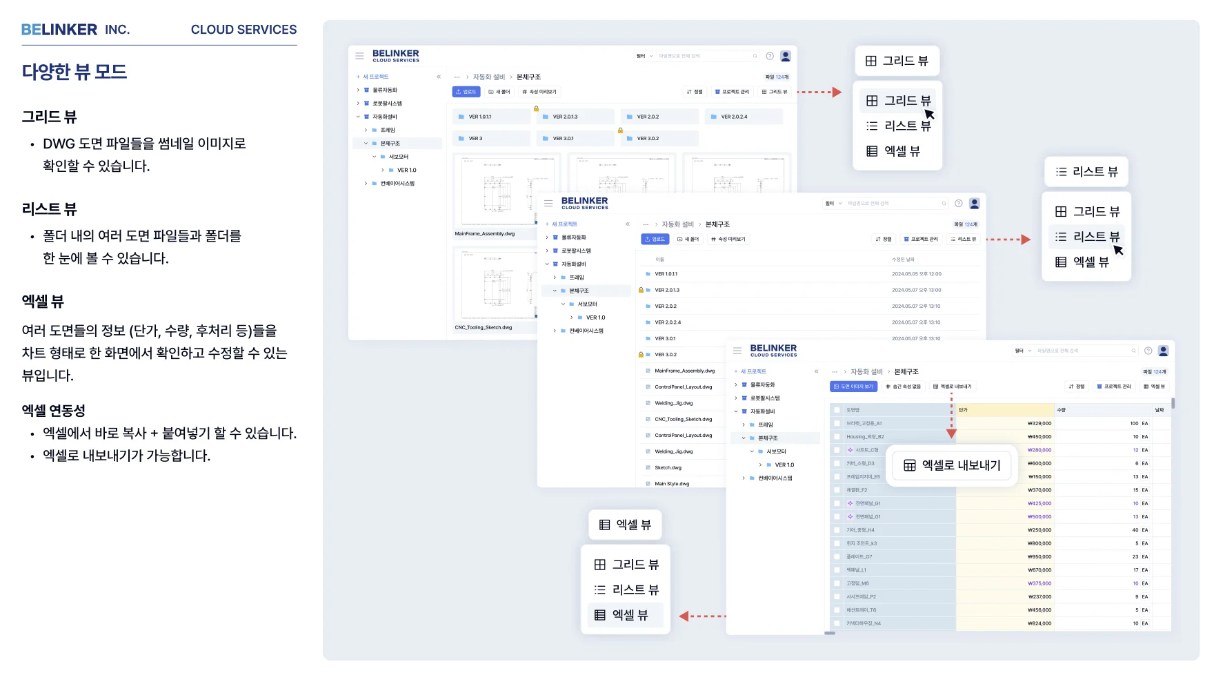 비링커 클라우드 서비스 - 뷰어 모드(그리드 뷰, 리스트 뷰, 엑셀 뷰)